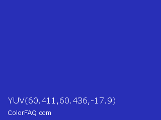 YUV 60.411,60.436,-17.9 Color is a normal blue color and the nearest color is Governor Bay #2f3cb3. Hex code #282fb7 and RGB value is rgb(40,47,183). In RGB color space, this color is composed of 16% red, 18% green, 72% blue, In CMYK color space, this color is composed of 78% cyan, 74% magenta, 0% yellow , 28% black , In HSL color space, this color has a hue angle of 237° , 64% saturation and 44% lightness.