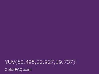 YUV 60.495,22.927,19.737 Color is a dark purple color and the nearest color is Honey Flower #4f1c70. Hex code #53286b and RGB value is rgb(83,40,107). In RGB color space, this color is composed of 33% red, 16% green, 42% blue, In CMYK color space, this color is composed of 22% cyan, 63% magenta, 0% yellow , 58% black , In HSL color space, this color has a hue angle of 279° , 46% saturation and 29% lightness.