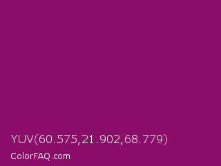 YUV 60.575,21.902,68.779 Color is a dark magenta color and the nearest color is Cardinal Pink #8c055e. Hex code #8b0c69 and RGB value is rgb(139,12,105). In RGB color space, this color is composed of 55% red, 5% green, 41% blue, In CMYK color space, this color is composed of 0% cyan, 91% magenta, 24% yellow , 45% black , In HSL color space, this color has a hue angle of 316° , 84% saturation and 30% lightness.
