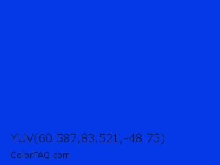 YUV 60.587,83.521,-48.75 Color is a normal blue color and the nearest color is Blue RYB #0247fe. Hex code #0538e6 and RGB value is rgb(5,56,230). In RGB color space, this color is composed of 2% red, 22% green, 90% blue, In CMYK color space, this color is composed of 98% cyan, 76% magenta, 0% yellow , 10% black , In HSL color space, this color has a hue angle of 226° , 96% saturation and 46% lightness.