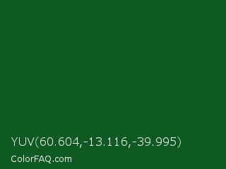 YUV 60.604,-13.116,-39.995 Color is a very dark green color and the nearest color is Parsley #134f19. Hex code #0f5922 and RGB value is rgb(15,89,34). In RGB color space, this color is composed of 6% red, 35% green, 13% blue, In CMYK color space, this color is composed of 83% cyan, 0% magenta, 62% yellow , 65% black , In HSL color space, this color has a hue angle of 135° , 71% saturation and 20% lightness.