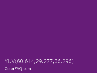 YUV 60.614,29.277,36.296 Color is a dark purple color and the nearest color is Midnight #702670. Hex code #661c78 and RGB value is rgb(102,28,120). In RGB color space, this color is composed of 40% red, 11% green, 47% blue, In CMYK color space, this color is composed of 15% cyan, 77% magenta, 0% yellow , 53% black , In HSL color space, this color has a hue angle of 288° , 62% saturation and 29% lightness.