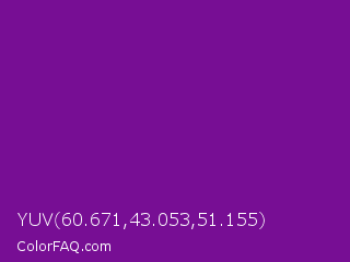 YUV 60.671,43.053,51.155 Color is a normal purple color and the nearest color is Seance #731e8f. Hex code #770e94 and RGB value is rgb(119,14,148). In RGB color space, this color is composed of 47% red, 5% green, 58% blue, In CMYK color space, this color is composed of 20% cyan, 91% magenta, 0% yellow , 42% black , In HSL color space, this color has a hue angle of 287° , 83% saturation and 32% lightness.