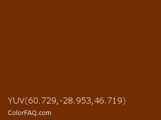 YUV 60.729,-28.953,46.719 Color is a dark orange color and the nearest color is Nutmeg Wood Finish #683600. Hex code #722d02 and RGB value is rgb(114,45,2). In RGB color space, this color is composed of 45% red, 18% green, 1% blue, In CMYK color space, this color is composed of 0% cyan, 61% magenta, 98% yellow , 55% black , In HSL color space, this color has a hue angle of 23° , 97% saturation and 23% lightness.