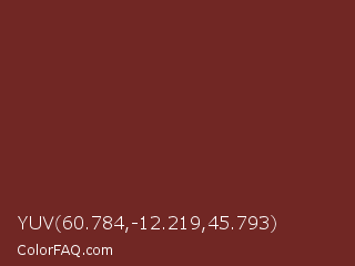YUV 60.784,-12.219,45.793 Color is a dark red color and the nearest color is Metallic Copper #71291d. Hex code #712724 and RGB value is rgb(113,39,36). In RGB color space, this color is composed of 44% red, 15% green, 14% blue, In CMYK color space, this color is composed of 0% cyan, 65% magenta, 68% yellow , 56% black , In HSL color space, this color has a hue angle of 2° , 52% saturation and 29% lightness.