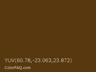 YUV 60.78,-23.063,23.872 Color is a very dark orange color and the nearest color is Pineapple #563c0d. Hex code #58380e and RGB value is rgb(88,56,14). In RGB color space, this color is composed of 35% red, 22% green, 5% blue, In CMYK color space, this color is composed of 0% cyan, 36% magenta, 84% yellow , 65% black , In HSL color space, this color has a hue angle of 34° , 73% saturation and 20% lightness.