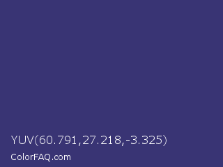 YUV 60.791,27.218,-3.325 Color is a normal indigo color and the nearest color is Minsk #3f307f. Hex code #393474 and RGB value is rgb(57,52,116). In RGB color space, this color is composed of 22% red, 20% green, 45% blue, In CMYK color space, this color is composed of 51% cyan, 55% magenta, 0% yellow , 55% black , In HSL color space, this color has a hue angle of 245° , 38% saturation and 33% lightness.