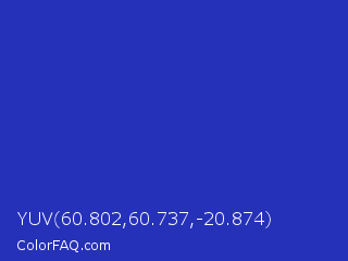 YUV 60.802,60.737,-20.874 Color is a normal blue color and the nearest color is Persian Blue #1c39bb. Hex code #2531b8 and RGB value is rgb(37,49,184). In RGB color space, this color is composed of 15% red, 19% green, 72% blue, In CMYK color space, this color is composed of 80% cyan, 73% magenta, 0% yellow , 28% black , In HSL color space, this color has a hue angle of 235° , 67% saturation and 43% lightness.