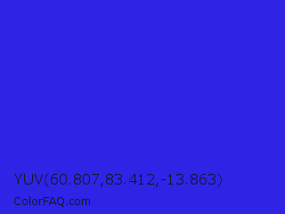YUV 60.807,83.412,-13.863 Color is a normal indigo color and the nearest color is Bluebonnet #1c1cf0. Hex code #2d24e6 and RGB value is rgb(45,36,230). In RGB color space, this color is composed of 18% red, 14% green, 90% blue, In CMYK color space, this color is composed of 80% cyan, 84% magenta, 0% yellow , 10% black , In HSL color space, this color has a hue angle of 243° , 80% saturation and 52% lightness.