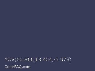 YUV 60.811,13.404,-5.973 Color is a dark blue color and the nearest color is Pickled Bluewood #314459. Hex code #363b58 and RGB value is rgb(54,59,88). In RGB color space, this color is composed of 21% red, 23% green, 35% blue, In CMYK color space, this color is composed of 39% cyan, 33% magenta, 0% yellow , 65% black , In HSL color space, this color has a hue angle of 231° , 24% saturation and 28% lightness.