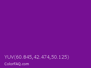 YUV 60.845,42.474,50.125 Color is a normal purple color and the nearest color is Seance #731e8f. Hex code #760f93 and RGB value is rgb(118,15,147). In RGB color space, this color is composed of 46% red, 6% green, 58% blue, In CMYK color space, this color is composed of 20% cyan, 90% magenta, 0% yellow , 42% black , In HSL color space, this color has a hue angle of 287° , 81% saturation and 32% lightness.
