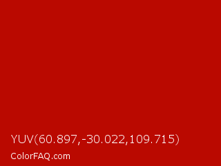 YUV 60.897,-30.022,109.715 Color is a normal red color and the nearest color is Guardsman Red #ba0101. Hex code #ba0900 and RGB value is rgb(186,9,-0). In RGB color space, this color is composed of 73% red, 4% green, 0% blue, In CMYK color space, this color is composed of 0% cyan, 95% magenta, 100% yellow , 27% black , In HSL color space, this color has a hue angle of 3° , 100% saturation and 36% lightness.