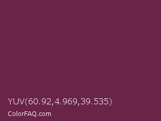 YUV 60.92,4.969,39.535 Color is a dark rose color and the nearest color is Tawny Port #692545. Hex code #6a2447 and RGB value is rgb(106,36,71). In RGB color space, this color is composed of 42% red, 14% green, 28% blue, In CMYK color space, this color is composed of 0% cyan, 66% magenta, 33% yellow , 58% black , In HSL color space, this color has a hue angle of 330° , 49% saturation and 28% lightness.