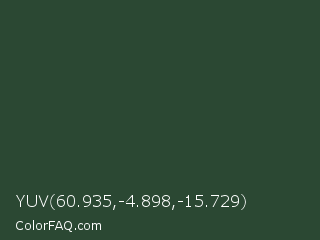 YUV 60.935,-4.898,-15.729 Color is a dark green color and the nearest color is Kombu Green #354230. Hex code #2b4833 and RGB value is rgb(43,72,51). In RGB color space, this color is composed of 17% red, 28% green, 20% blue, In CMYK color space, this color is composed of 40% cyan, 0% magenta, 29% yellow , 72% black , In HSL color space, this color has a hue angle of 137° , 25% saturation and 23% lightness.