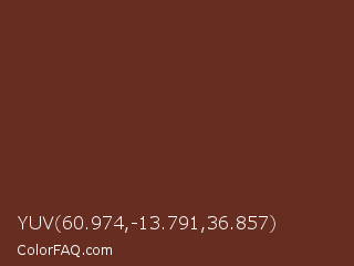 YUV 60.974,-13.791,36.857 Color is a dark red color and the nearest color is Liver Organ #6c2e1f. Hex code #672d21 and RGB value is rgb(103,45,33). In RGB color space, this color is composed of 40% red, 18% green, 13% blue, In CMYK color space, this color is composed of 0% cyan, 56% magenta, 68% yellow , 60% black , In HSL color space, this color has a hue angle of 10° , 51% saturation and 27% lightness.