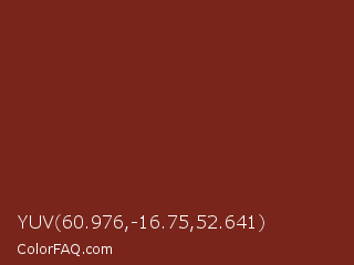 YUV 60.976,-16.75,52.641 Color is a dark red color and the nearest color is Crown Of Thorns #771f1f. Hex code #79251b and RGB value is rgb(121,37,27). In RGB color space, this color is composed of 47% red, 15% green, 11% blue, In CMYK color space, this color is composed of 0% cyan, 69% magenta, 78% yellow , 53% black , In HSL color space, this color has a hue angle of 6° , 64% saturation and 29% lightness.