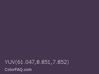 YUV 61.047,8.851,7.852 Color is a dark purple color and the nearest color is Voodoo #533455. Hex code #46354f and RGB value is rgb(70,53,79). In RGB color space, this color is composed of 27% red, 21% green, 31% blue, In CMYK color space, this color is composed of 11% cyan, 33% magenta, 0% yellow , 69% black , In HSL color space, this color has a hue angle of 279° , 20% saturation and 26% lightness.