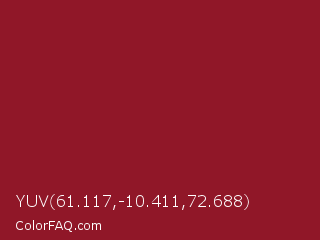 YUV 61.117,-10.411,72.688 Color is a normal red color and the nearest color is Old Brick #901e1e. Hex code #901728 and RGB value is rgb(144,23,40). In RGB color space, this color is composed of 56% red, 9% green, 16% blue, In CMYK color space, this color is composed of 0% cyan, 84% magenta, 72% yellow , 44% black , In HSL color space, this color has a hue angle of 352° , 72% saturation and 33% lightness.