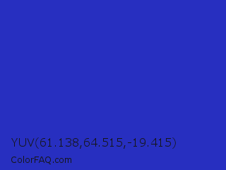 YUV 61.138,64.515,-19.415 Color is a normal blue color and the nearest color is Persian Blue #1c39bb. Hex code #272fc0 and RGB value is rgb(39,47,192). In RGB color space, this color is composed of 15% red, 18% green, 75% blue, In CMYK color space, this color is composed of 80% cyan, 76% magenta, 0% yellow , 25% black , In HSL color space, this color has a hue angle of 237° , 66% saturation and 45% lightness.