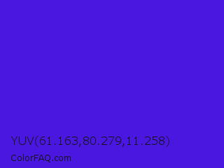 YUV 61.163,80.279,11.258 Color is a normal indigo color and the nearest color is Han Purple #5218fa. Hex code #4a17e0 and RGB value is rgb(74,23,224). In RGB color space, this color is composed of 29% red, 9% green, 88% blue, In CMYK color space, this color is composed of 67% cyan, 90% magenta, 0% yellow , 12% black , In HSL color space, this color has a hue angle of 255° , 81% saturation and 48% lightness.