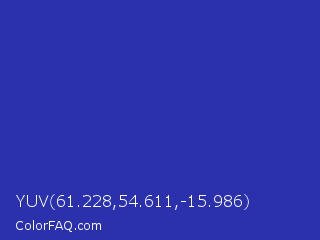 YUV 61.228,54.611,-15.986 Color is a normal blue color and the nearest color is Governor Bay #2f3cb3. Hex code #2b31ac and RGB value is rgb(43,49,172). In RGB color space, this color is composed of 17% red, 19% green, 67% blue, In CMYK color space, this color is composed of 75% cyan, 72% magenta, 0% yellow , 33% black , In HSL color space, this color has a hue angle of 237° , 60% saturation and 42% lightness.