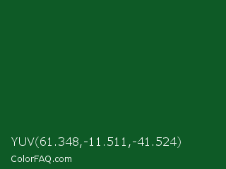 YUV 61.348,-11.511,-41.524 Color is a very dark green color and the nearest color is Parsley #134f19. Hex code #0e5a26 and RGB value is rgb(14,90,38). In RGB color space, this color is composed of 5% red, 35% green, 15% blue, In CMYK color space, this color is composed of 84% cyan, 0% magenta, 58% yellow , 65% black , In HSL color space, this color has a hue angle of 139° , 73% saturation and 20% lightness.