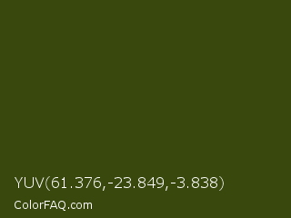 YUV 61.376,-23.849,-3.838 Color is a very dark lime color and the nearest color is Clover #384910. Hex code #39490d and RGB value is rgb(57,73,13). In RGB color space, this color is composed of 22% red, 29% green, 5% blue, In CMYK color space, this color is composed of 22% cyan, 0% magenta, 82% yellow , 71% black , In HSL color space, this color has a hue angle of 76° , 70% saturation and 17% lightness.