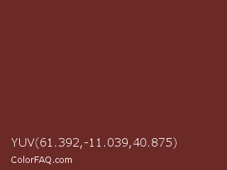 YUV 61.392,-11.039,40.875 Color is a dark red color and the nearest color is Liver Organ #6c2e1f. Hex code #6c2a27 and RGB value is rgb(108,42,39). In RGB color space, this color is composed of 42% red, 16% green, 15% blue, In CMYK color space, this color is composed of 0% cyan, 61% magenta, 64% yellow , 58% black , In HSL color space, this color has a hue angle of 3° , 47% saturation and 29% lightness.