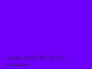 YUV 61.39,92.985,42.631 Color is a normal violet color and the nearest color is Electric Indigo #6f00ff. Hex code #6e00fa and RGB value is rgb(110,-0,250). In RGB color space, this color is composed of 43% red, 0% green, 98% blue, In CMYK color space, this color is composed of 56% cyan, 100% magenta, 0% yellow , 2% black , In HSL color space, this color has a hue angle of 266° , 100% saturation and 49% lightness.