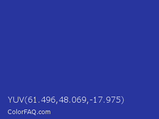 YUV 61.496,48.069,-17.975 Color is a normal blue color and the nearest color is Blue Pigment #333399. Hex code #29359f and RGB value is rgb(41,53,159). In RGB color space, this color is composed of 16% red, 21% green, 62% blue, In CMYK color space, this color is composed of 74% cyan, 67% magenta, 0% yellow , 38% black , In HSL color space, this color has a hue angle of 234° , 59% saturation and 39% lightness.