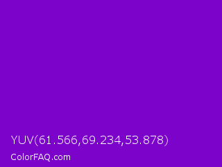 YUV 61.566,69.234,53.878 Color is a normal purple color and the nearest color is French Violet #8806ce. Hex code #7b03ca and RGB value is rgb(123,3,202). In RGB color space, this color is composed of 48% red, 1% green, 79% blue, In CMYK color space, this color is composed of 39% cyan, 99% magenta, 0% yellow , 21% black , In HSL color space, this color has a hue angle of 276° , 97% saturation and 40% lightness.