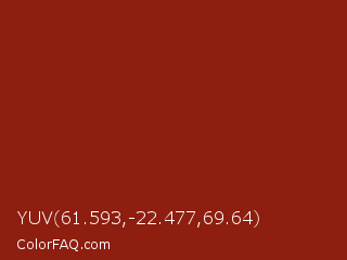 YUV 61.593,-22.477,69.64 Color is a normal red color and the nearest color is Old Brick #901e1e. Hex code #8d1e10 and RGB value is rgb(141,30,16). In RGB color space, this color is composed of 55% red, 12% green, 6% blue, In CMYK color space, this color is composed of 0% cyan, 79% magenta, 89% yellow , 45% black , In HSL color space, this color has a hue angle of 7° , 80% saturation and 31% lightness.