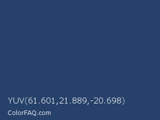 YUV 61.601,21.889,-20.698 Color is a dark blue color and the nearest color is Rhino #2e3f62. Hex code #26416a and RGB value is rgb(38,65,106). In RGB color space, this color is composed of 15% red, 25% green, 42% blue, In CMYK color space, this color is composed of 64% cyan, 39% magenta, 0% yellow , 58% black , In HSL color space, this color has a hue angle of 216° , 47% saturation and 28% lightness.