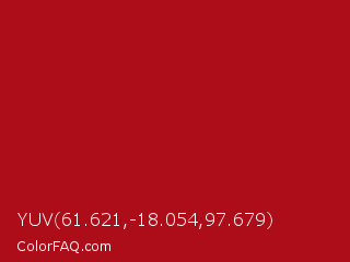 YUV 61.621,-18.054,97.679 Color is a normal red color and the nearest color is Carnelian #b31b1b. Hex code #ad0c19 and RGB value is rgb(173,12,25). In RGB color space, this color is composed of 68% red, 5% green, 10% blue, In CMYK color space, this color is composed of 0% cyan, 93% magenta, 86% yellow , 32% black , In HSL color space, this color has a hue angle of 355° , 87% saturation and 36% lightness.