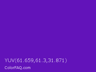 YUV 61.659,61.3,31.871 Color is a normal violet color and the nearest color is Purple Heart Crayola #652dc1. Hex code #6213ba and RGB value is rgb(98,19,186). In RGB color space, this color is composed of 38% red, 7% green, 73% blue, In CMYK color space, this color is composed of 47% cyan, 90% magenta, 0% yellow , 27% black , In HSL color space, this color has a hue angle of 268° , 81% saturation and 40% lightness.