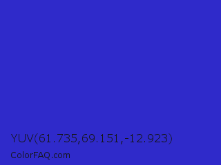 YUV 61.735,69.151,-12.923 Color is a normal indigo color and the nearest color is Persian Blue #1c39bb. Hex code #2f2aca and RGB value is rgb(47,42,202). In RGB color space, this color is composed of 18% red, 16% green, 79% blue, In CMYK color space, this color is composed of 77% cyan, 79% magenta, 0% yellow , 21% black , In HSL color space, this color has a hue angle of 242° , 66% saturation and 48% lightness.