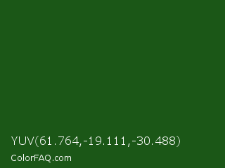 YUV 61.764,-19.111,-30.488 Color is a very dark green color and the nearest color is Parsley #134f19. Hex code #1b5717 and RGB value is rgb(27,87,23). In RGB color space, this color is composed of 11% red, 34% green, 9% blue, In CMYK color space, this color is composed of 69% cyan, 0% magenta, 74% yellow , 66% black , In HSL color space, this color has a hue angle of 116° , 58% saturation and 22% lightness.