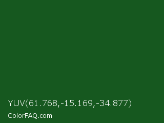 YUV 61.768,-15.169,-34.877 Color is a very dark green color and the nearest color is Parsley #134f19. Hex code #16581f and RGB value is rgb(22,88,31). In RGB color space, this color is composed of 9% red, 35% green, 12% blue, In CMYK color space, this color is composed of 75% cyan, 0% magenta, 65% yellow , 65% black , In HSL color space, this color has a hue angle of 128° , 60% saturation and 22% lightness.