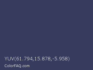 YUV 61.794,15.878,-5.958 Color is a dark blue color and the nearest color is Rhino #2e3f62. Hex code #373b5e and RGB value is rgb(55,59,94). In RGB color space, this color is composed of 22% red, 23% green, 37% blue, In CMYK color space, this color is composed of 41% cyan, 37% magenta, 0% yellow , 63% black , In HSL color space, this color has a hue angle of 234° , 26% saturation and 29% lightness.