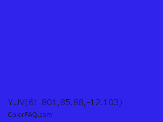 YUV 61.801,85.88,-12.103 Color is a normal indigo color and the nearest color is Bluebonnet #1c1cf0. Hex code #3023ec and RGB value is rgb(48,35,236). In RGB color space, this color is composed of 19% red, 14% green, 93% blue, In CMYK color space, this color is composed of 80% cyan, 85% magenta, 0% yellow , 7% black , In HSL color space, this color has a hue angle of 244° , 84% saturation and 53% lightness.