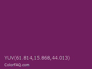 YUV 61.814,15.868,44.013 Color is a dark magenta color and the nearest color is Byzantium #702963. Hex code #701e5e and RGB value is rgb(112,30,94). In RGB color space, this color is composed of 44% red, 12% green, 37% blue, In CMYK color space, this color is composed of 0% cyan, 73% magenta, 16% yellow , 56% black , In HSL color space, this color has a hue angle of 313° , 58% saturation and 28% lightness.