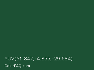 YUV 61.847,-4.855,-29.684 Color is a very dark green color and the nearest color is Cal Poly Pomona Green #1e4d2b. Hex code #1c5134 and RGB value is rgb(28,81,52). In RGB color space, this color is composed of 11% red, 32% green, 20% blue, In CMYK color space, this color is composed of 65% cyan, 0% magenta, 36% yellow , 68% black , In HSL color space, this color has a hue angle of 147° , 49% saturation and 21% lightness.