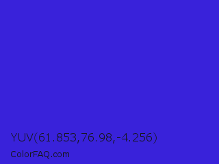 YUV 61.853,76.98,-4.256 Color is a normal indigo color and the nearest color is Interdimensional Blue #360ccc. Hex code #3922da and RGB value is rgb(57,34,218). In RGB color space, this color is composed of 22% red, 13% green, 85% blue, In CMYK color space, this color is composed of 74% cyan, 84% magenta, 0% yellow , 15% black , In HSL color space, this color has a hue angle of 248° , 73% saturation and 49% lightness.