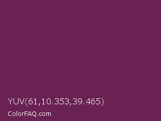 YUV 61,10.353,39.465 Color is a dark magenta color and the nearest color is Finn #692d54. Hex code #6a2252 and RGB value is rgb(106,34,82). In RGB color space, this color is composed of 42% red, 13% green, 32% blue, In CMYK color space, this color is composed of 0% cyan, 68% magenta, 23% yellow , 58% black , In HSL color space, this color has a hue angle of 320° , 51% saturation and 27% lightness.