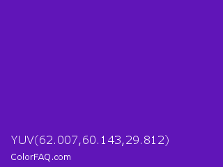 YUV 62.007,60.143,29.812 Color is a normal violet color and the nearest color is Purple Heart Crayola #652dc1. Hex code #6015b8 and RGB value is rgb(96,21,184). In RGB color space, this color is composed of 38% red, 8% green, 72% blue, In CMYK color space, this color is composed of 48% cyan, 89% magenta, 0% yellow , 28% black , In HSL color space, this color has a hue angle of 268° , 80% saturation and 40% lightness.
