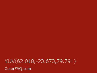 YUV 62.018,-23.673,79.791 Color is a normal red color and the nearest color is Tamarillo #991613. Hex code #99190e and RGB value is rgb(153,25,14). In RGB color space, this color is composed of 60% red, 10% green, 5% blue, In CMYK color space, this color is composed of 0% cyan, 84% magenta, 91% yellow , 40% black , In HSL color space, this color has a hue angle of 5° , 83% saturation and 33% lightness.