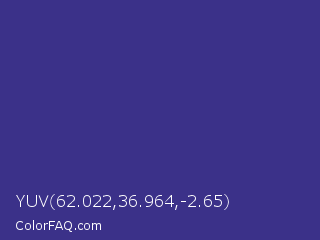 YUV 62.022,36.964,-2.65 Color is a normal indigo color and the nearest color is Minsk #3f307f. Hex code #3b3189 and RGB value is rgb(59,49,137). In RGB color space, this color is composed of 23% red, 19% green, 54% blue, In CMYK color space, this color is composed of 57% cyan, 64% magenta, 0% yellow , 46% black , In HSL color space, this color has a hue angle of 247° , 47% saturation and 36% lightness.
