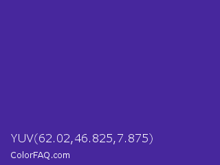 YUV 62.02,46.825,7.875 Color is a normal indigo color and the nearest color is Daisy Bush #4f2398. Hex code #47279d and RGB value is rgb(71,39,157). In RGB color space, this color is composed of 28% red, 15% green, 62% blue, In CMYK color space, this color is composed of 55% cyan, 75% magenta, 0% yellow , 38% black , In HSL color space, this color has a hue angle of 256° , 60% saturation and 38% lightness.