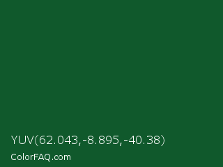 YUV 62.043,-8.895,-40.38 Color is a very dark green color and the nearest color is Cal Poly Pomona Green #1e4d2b. Hex code #10592c and RGB value is rgb(16,89,44). In RGB color space, this color is composed of 6% red, 35% green, 17% blue, In CMYK color space, this color is composed of 82% cyan, 0% magenta, 51% yellow , 65% black , In HSL color space, this color has a hue angle of 143° , 70% saturation and 21% lightness.