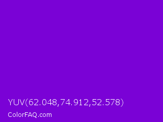 YUV 62.048,74.912,52.578 Color is a normal purple color and the nearest color is French Violet #8806ce. Hex code #7a02d6 and RGB value is rgb(122,2,214). In RGB color space, this color is composed of 48% red, 1% green, 84% blue, In CMYK color space, this color is composed of 43% cyan, 99% magenta, 0% yellow , 16% black , In HSL color space, this color has a hue angle of 274° , 98% saturation and 42% lightness.